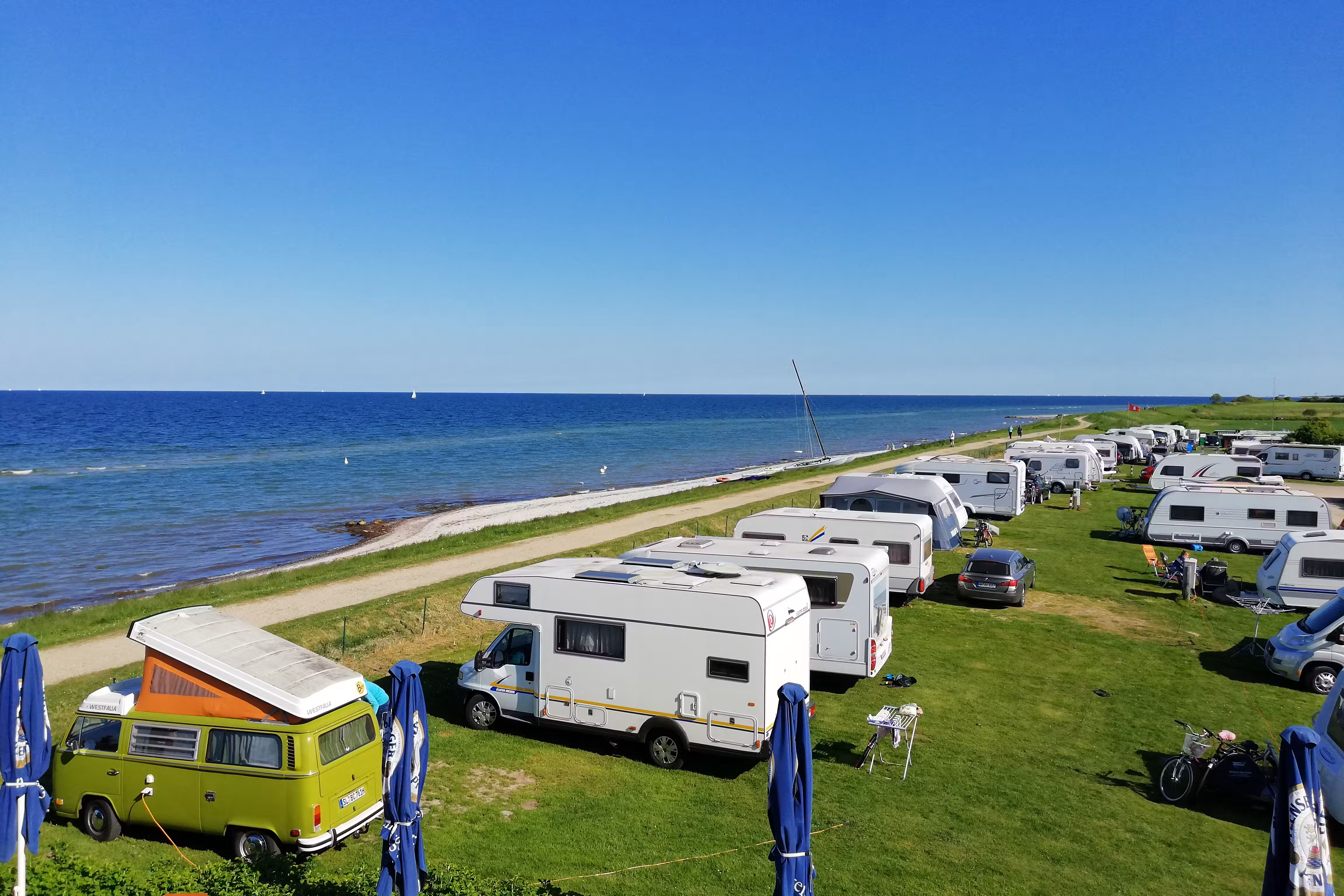 Die Stellplätze sind sowohl für Wohnmobile als auch für Caravans und Zelte geeignet. Einige Plätze bieten einen direkten Blick auf die Ostsee, während andere einen schönen Ausblick auf Felder, Wiesen und Wälder bieten. Alle Stellplätze sind mit Stromanschlüssen ausgestattet, und es gibt spezielle Bereiche für Zeltcamper.