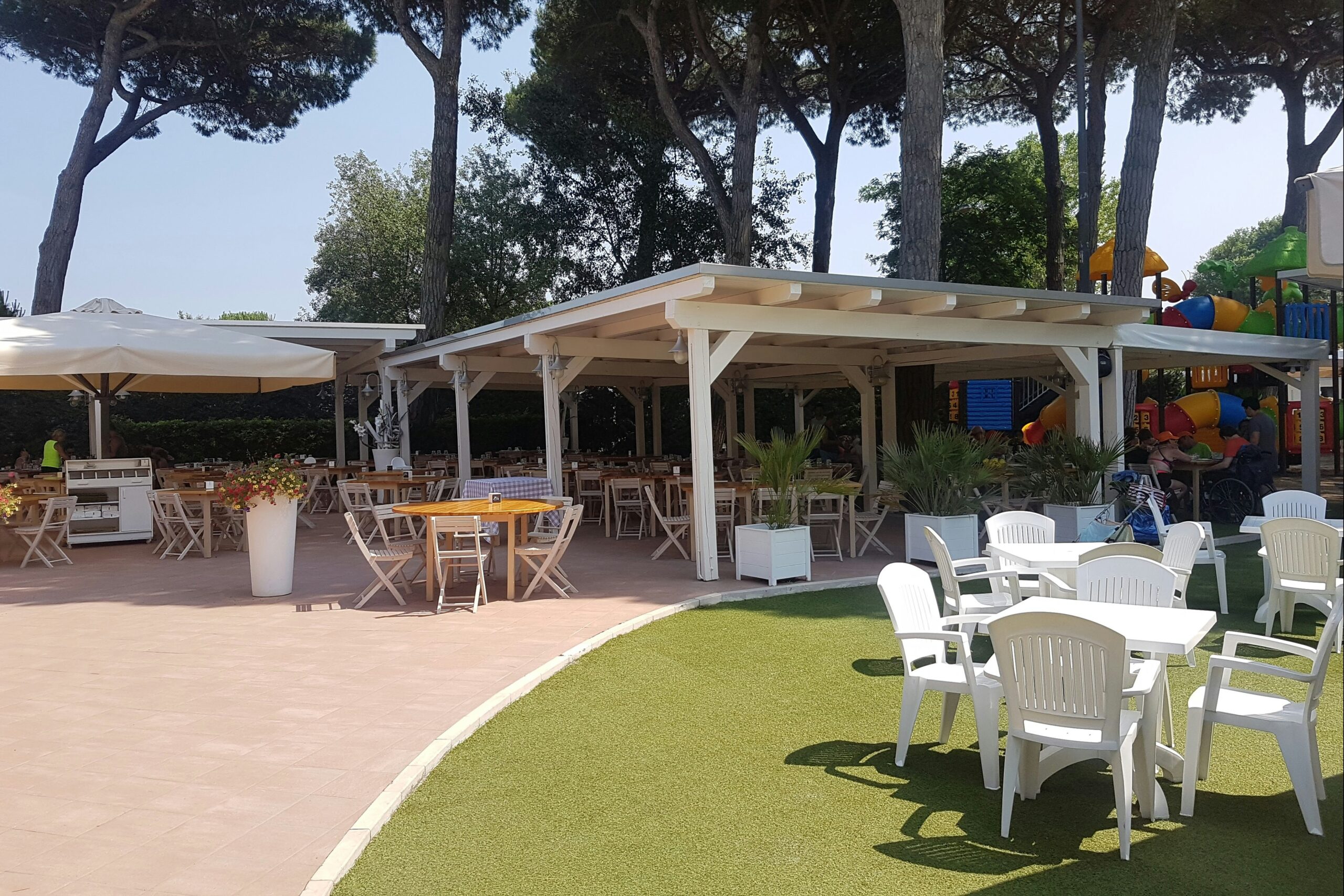 Auf dem Platz gibt es ein Restaurant, das köstliche italienische Küche anbietet. So können die Gäste die regionalen Spezialitäten genießen, ohne den Campingplatz verlassen zu müssen. Zudem steht ein kleiner Kiosk zur Verfügung, in dem Sie die wichtigsten Lebensmittel und Campingbedarf kaufen können. Ein Brötchenservice sorgt dafür, dass Sie jeden Morgen frisch gebackene Brötchen genießen können.